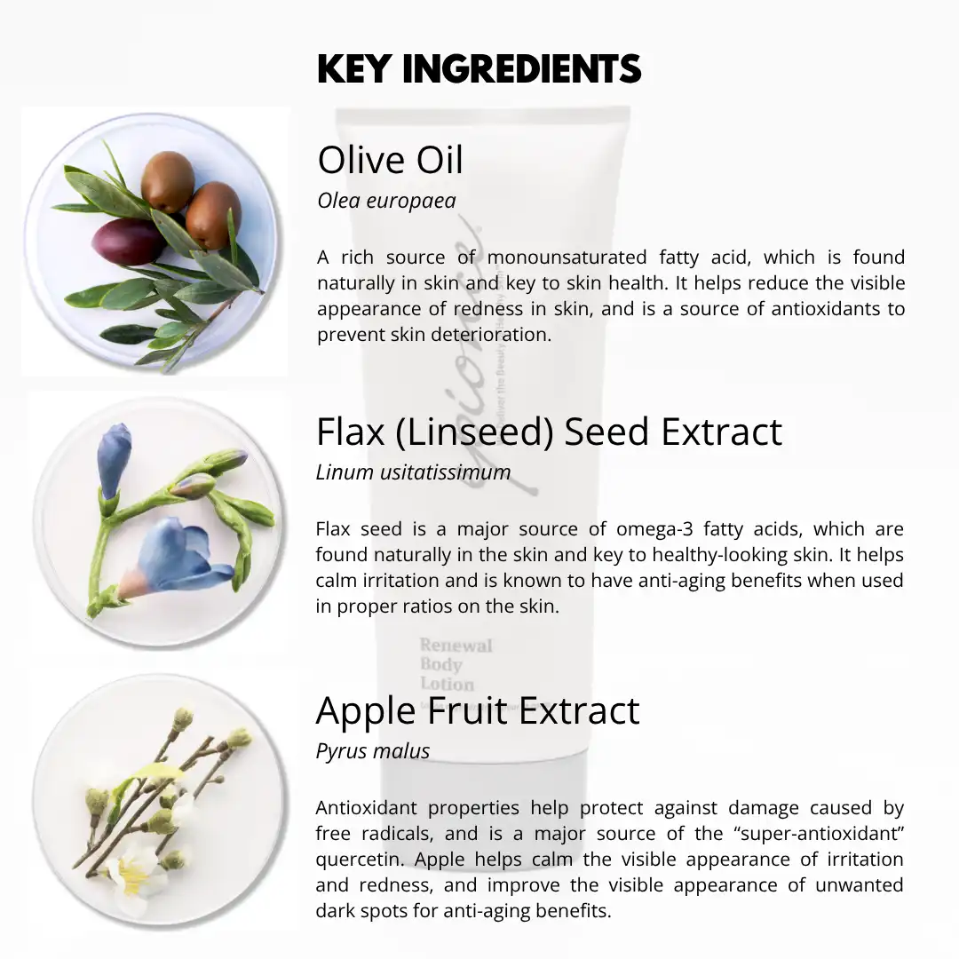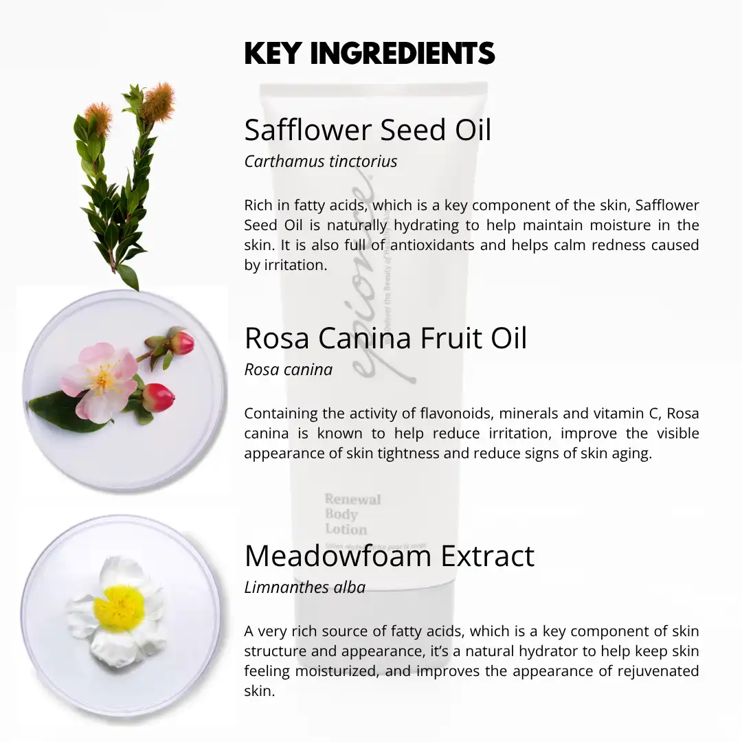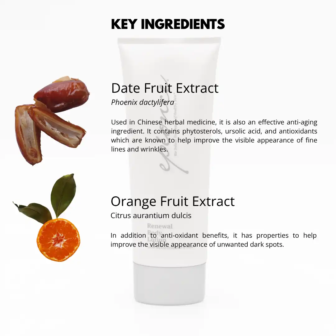 Made with the same key active ingredients as the Epionce flagship Renewal Facial Cream, Renewal Body Lotion is an advanced anti-aging moisturizer for the body. Daily use improves the visible appearance of dry, photo aged skin on the arms, legs and the body while increasing visible firmness and tone.