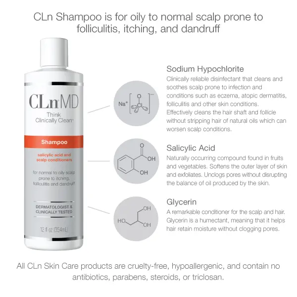 CLn Shampoo was designed by physicians to remove unwanted oils and dead skin cells in scalps and beards. It is effective cleansing for those prone to: